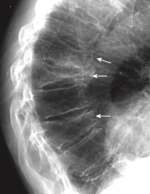 - Sự cốt hoá này được thấy dọc theo mặt trước hoặc mặt trước của ít nhất bốn thân đốt sống liền kề. Không giống như bệnh thoái hóa đĩa đệm, khoang đĩa đệm và các khớp diện nhỏ (thường) được bảo tồn. Cốt hoá bắt cầu trong DISH hơi tách ra khỏi thân đốt sống (xem Hình 9, A).