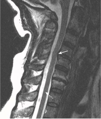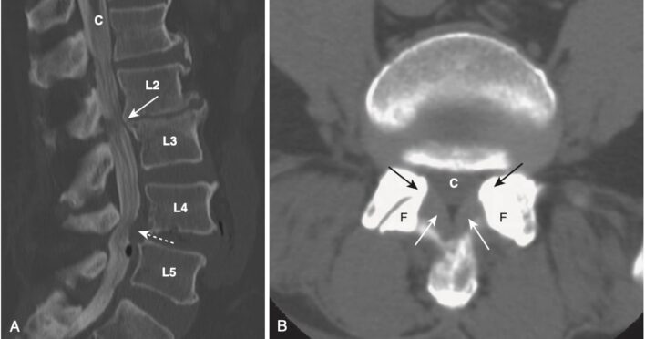 - Cốt hoá dây chằng dọc sau (Ossification of the posterior longitudinal ligament, OPLL) thường xuất hiện với DISH và được nhìn thấy rõ hơn trên CT và MRI. Tình trạng này có thể gây chèn ép tủy sống, đặc biệt là ở cột sống cổ, do ống sống bị thu hẹp (xem Hình 9, B).