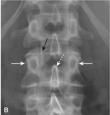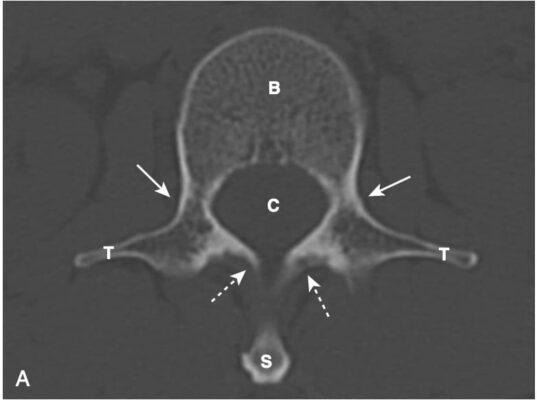 - Trong hình chiếu thẳng, mỗi thân đốt sống hiển thị hai cuống cung hình oval có thể nhìn thấy được ở hai bên của thân đốt sống. Các cuống cung của L5 thường rất khó nhìn thấy ngay cả ở những người bình thường, bởi vì độ ưỡn của cột sống thắt lưng (xem Hình 1, B).