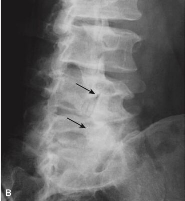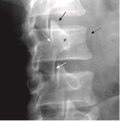 - Gãy xẹp do loãng xương thường ảnh hưởng đến các mặt trước và mặt trên của thân đốt sống mà không ảnh hưởng đến phần thân sau. Thường có sự chênh lệch chiều cao giữa mặt trước và mặt sau của cùng một thân đốt sống quá 3 mm. Hoặc là, phần thân bị xẹp thường ngắn hơn> 20% so với thân đốt sống trên hoặc dưới.