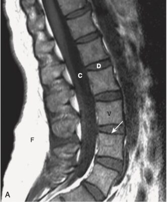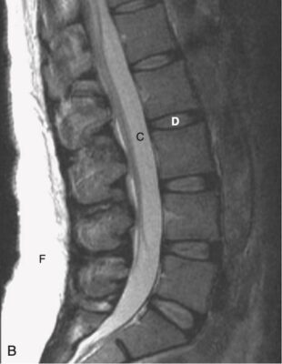 - Trên hình ảnh MRI cột sống đứng dọc T1W, các thân đốt sống, chứa tủy xương, thông thường sẽ có cường độ tín hiệu cao (sáng), các đĩa đệm sẽ có cường độ tín hiệu thấp hơn và dịch não tủy (CSF ) trong túi cùng sẽ có cường độ tín hiệu thấp (tối) (Hình 4, A).