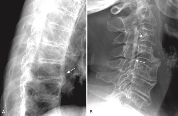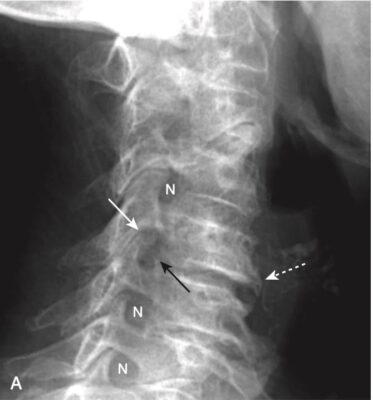 - Ở cột sống cổ, các gai xương ở các khớp mỏm móc đốt sống có thể tạo ra các lồi xương vào trong các lỗ ghép thần kinh hình bầu dục bình thường, có thể thấy được trên phim X quang thường quy chụp chếch (Hình 8, A).