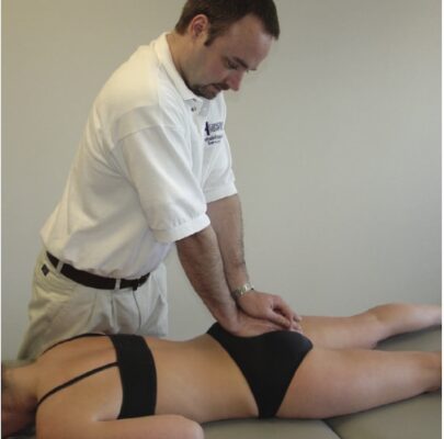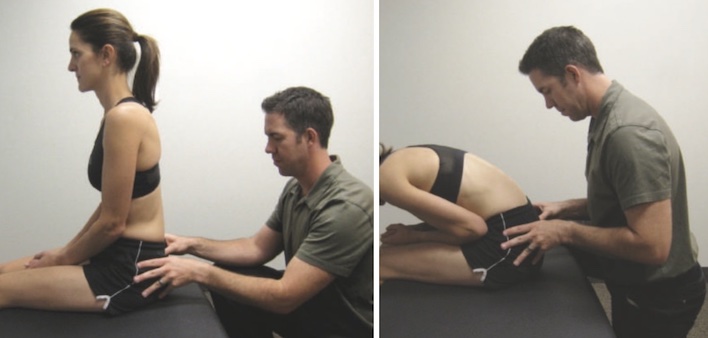 - Bệnh nhân nằm sấp, người khám đặt hai bàn tay chồng lên nhau ở mức S2 (Hình 5) và áp dụng một lực ép hướng ra trước.