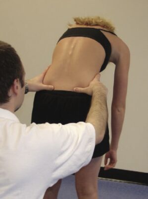 - Bệnh nhân đứng thẳng, người khám ở phía sau bệnh nhân và đặt hai ngón tay cái lên gai chậu sau trên (PSIS). Yêu cầu bệnh nhân từ từ cúi người về phía trước, trong khi người khám quan sát các ngón tay cái đặt trên PSIS (Hình 9).