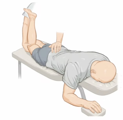 - Bệnh nhân nằm sấp. Người khám đặt một bàn tay bên dưới một gai chậu trước trên (ASIS) của bệnh nhân và yêu cầu bệnh nhân duỗi quá chân được thử lên 15 độ (Hình 11).