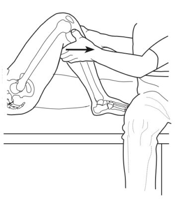 Tư thế bệnh nhân nằm sấp, gối gập 30 độ. Một tay người khám cố định xương đùi trong khi tay kia đẩy xương chày ra sau.