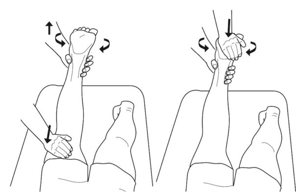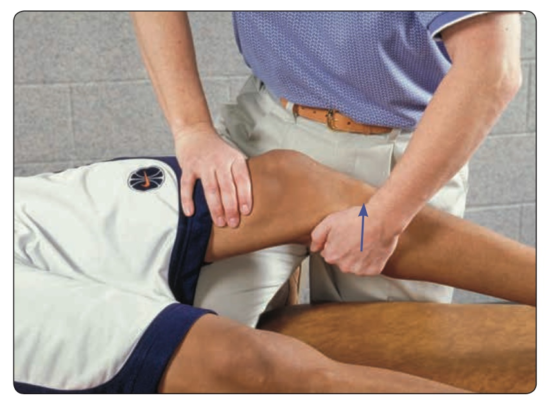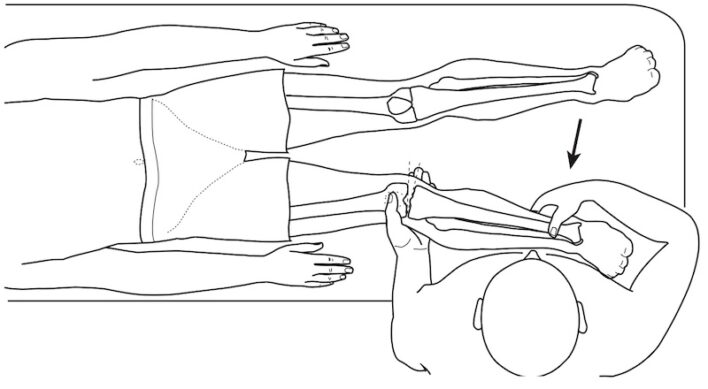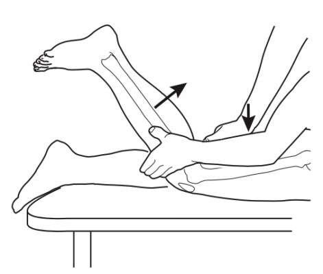 Một tay người khám cố định đùi, tay kia nắm cổ hoặc bàn chân, xoay xương chày vào trong và ra ngoài trong khi tạo lực kéo tách khớp gối, sau đó tạo lực ép lên gối.