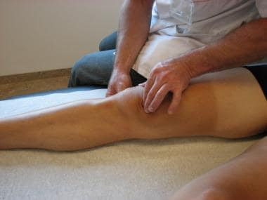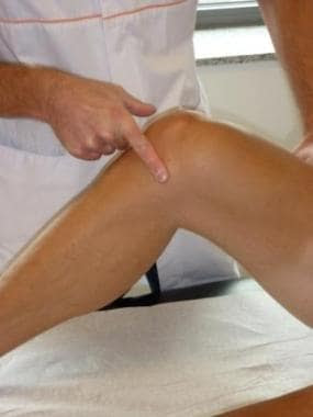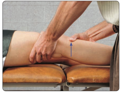 Tay người khám đặt ngay phía trên xương bánh chè, đẩy xuống đùi và yêu cầu bệnh nhân co cơ tứ đầu đùi.