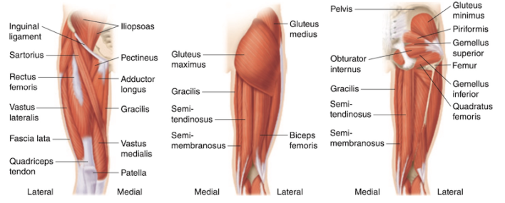 - Xoay ngoài: Cơ hình lê (piriformis), bịt trong, bịt ngoài và hai cơ sinh đôi. Cơ vuông đùi và lược là cơ phụ.