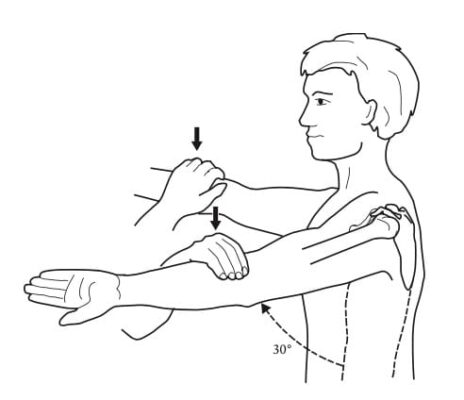 - Bệnh nhân gấp tay phía trước 90 độ với khuỷu tay duỗi thẳng. Sau đó khép cánh tay 10-15 độ vào trong. Sau đó bệnh nhân quay sấp cẳng tay sao cho ngón cái chỉ xuống sàn. Người khám lực đẩy xuống cổ tay bệnh nhân trong khi bệnh nhân kháng lại. Sau đó bệnh nhân quay ngửa cẳng tay sao cho lòng bàn tay hướng lên và người khám lại áp dụng lực lên cổ tay trong khi bệnh nhân kháng lại.
