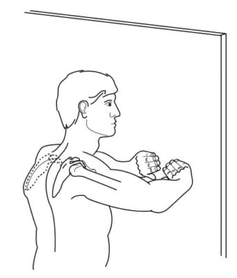 - Bệnh nhân ở tư thế đứng, yêu cầu bệnh nhân gập vai ra trước 90 độ và đẩy chống lại một bức tường, lập lại 10-20 lần.