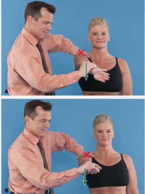 - Bệnh nhân đứng thư giãn với cánh tay dọc thân mình. Nắm lấy cánh tay và kéo xuống dưới.