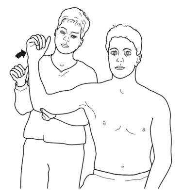 - Bệnh nhân ngồi hoặc đứng. Đặt vai ở tư thế dạng 90 độ và nâng đỡ cánh tay trong mặt phẳng xương bả vai. Yêu cầu bệnh nhân gấp khuỷu tay 90 độ. Sau đó bệnh nhân cố gắng xoay ngoài có kháng.