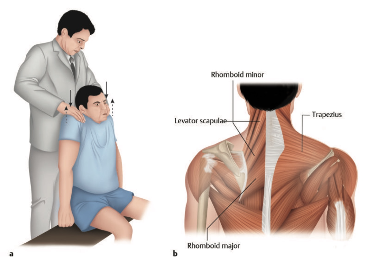Nâng bả vai có kháng hai bên. Đánh giá (bậc 3-5) được thực hiện ở tư thế ngồi hoặc đứng (Hình 1). Yếu cơ nâng bả vai chứng tỏ một bệnh lý nghiêm trọng. Động tác này có sự tham gia của các cơ: cơ Thang (dây thần kinh sọ XI), cơ Nâng vai (rễ C3, C4 và đôi khi C5) và các cơ nâng vai phụ (cơ trám lớn, trám bé).