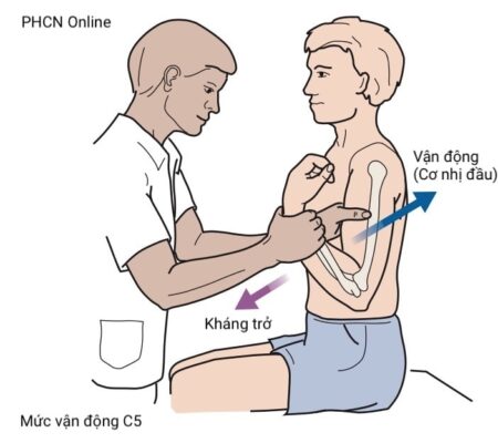 Cơ nhị đầu, là cơ gấp khuỷu tay, được phân bố bởi dây thần kinh cơ bì và đại diện cho mức rễ C5. Nhiều tác giả cũng xem cơ delta, được phân bố bởi dây thần kinh nách, là một cơ C5 chủ chốt. Bệnh nhân gập khuỷu với cẳng tay ngửa hoàn toàn. Kháng lại chuyển động này với bàn tay của bạn đặt trên mặt trước giữa cẳng tay.