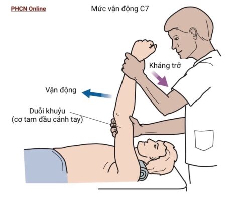 Cơ tam đầu cánh tay (duỗi khuỷu tay) được đánh giá để xác định mức rễ C7 (Hình 5). Cơ tam đầu được phân bố bởi dây thần kinh quay.