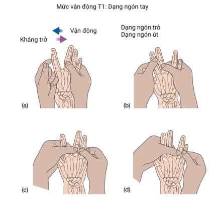 Các cơ dạng ngón trỏ và ngón út (cơ dạng ngón út, cơ gian cốt mu tay thứ nhất) được khám để đánh giá mức rễ T1 (Hình 7). Những cơ này được phân bố bởi dây thần kinh trụ.