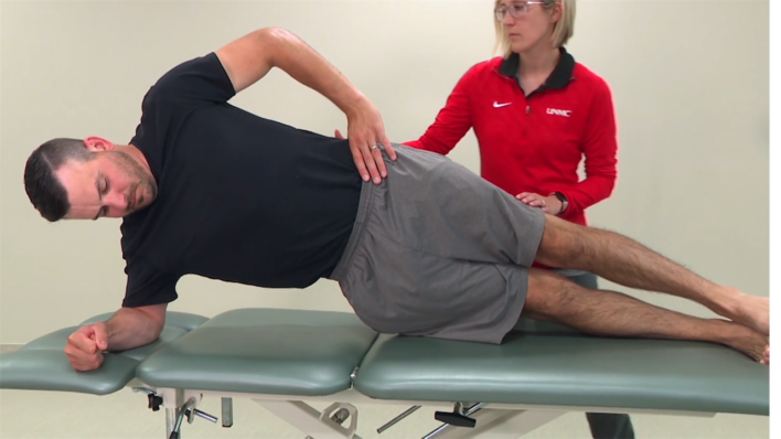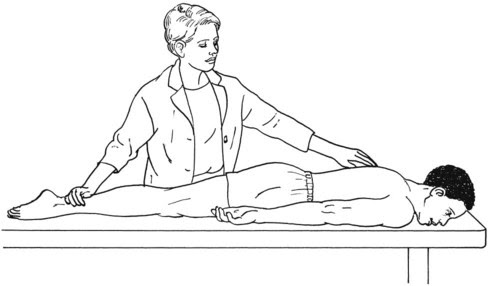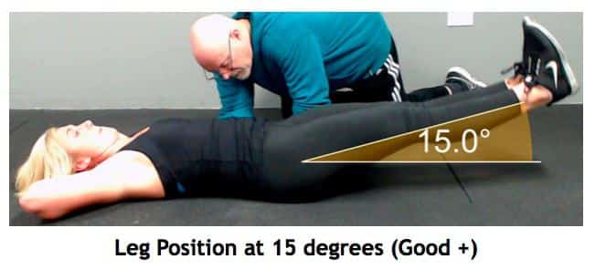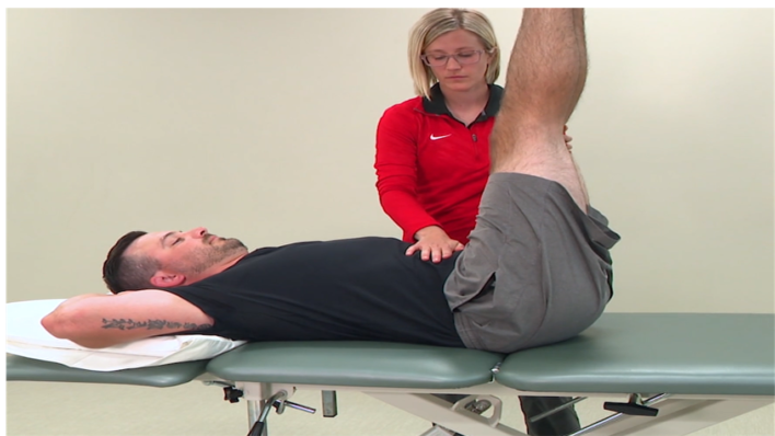 Yêu cầu bệnh nhân từ từ hạ hai chân xuống trong lúc vẫn giữ nghiêng chậụ ra sau (thắt lưng sát mặt giường) và đánh giá góc độ giữ chân khi hạ xuống.