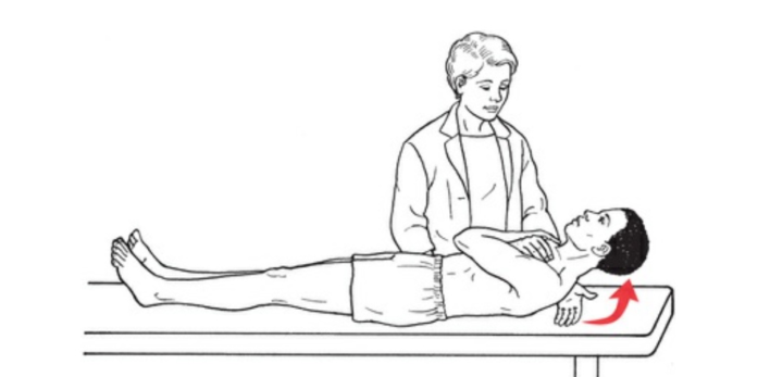 Như hình vẽ, yêu cầu bệnh nhân nhấc hông lên tạo thành một đường thẳng.