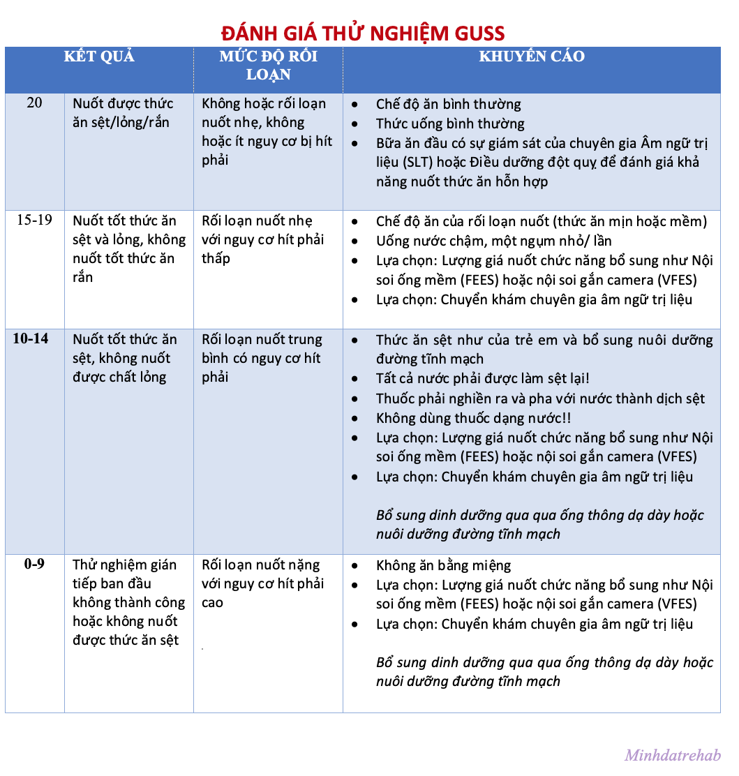 Một phương pháp sàng lọc giá trị là GUSS (Gugging Swallowing Screen), thường được thực hiện bởi người điều dưỡng đột quỵ, tiến hành tại giường bệnh.