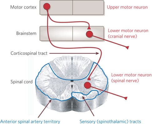 - Các dấu hiệu neuron vận động trên (UMN, upper motor neuron) (trung ương) bao gồm tăng trương lực (co cứng), liệt, tăng phản xạ gân xương và babinski dương tính