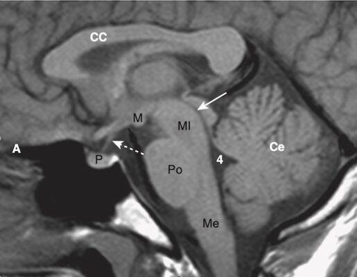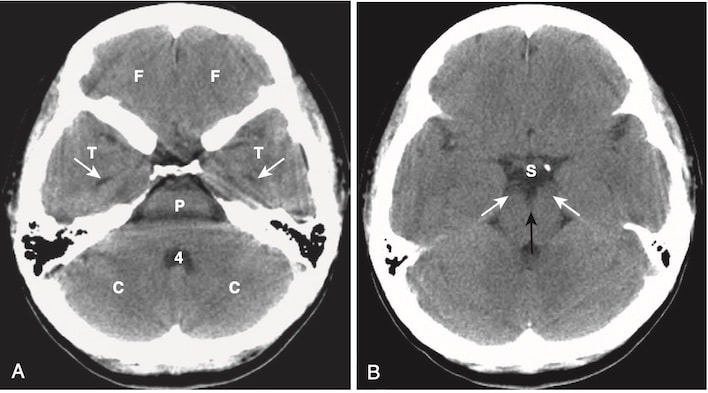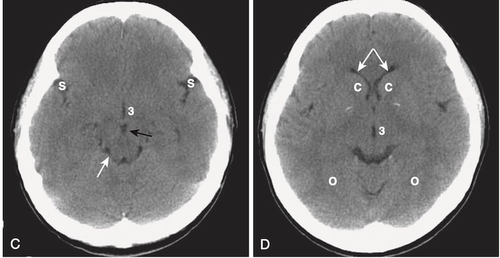 - Sự thoát vị của não có thể biểu hiện, một phần, bởi sự xoá mờ của các bể đáy (xem Hình 10, B).