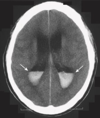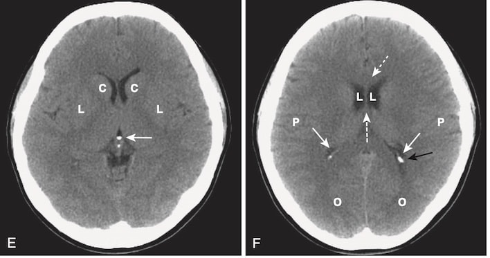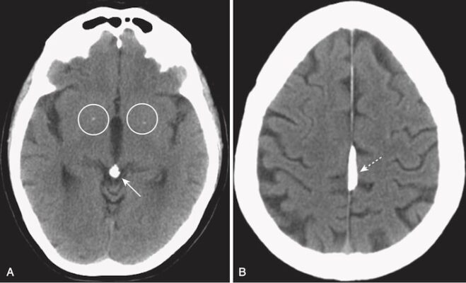 - Vôi hóa có thể thấy trên CT não và không phải bệnh lý (Hình 2). Vôi hóa sinh lý có xu hướng tăng dần theo tuổi tác.