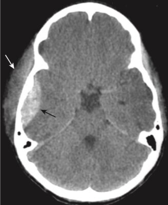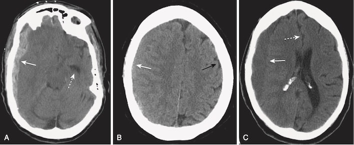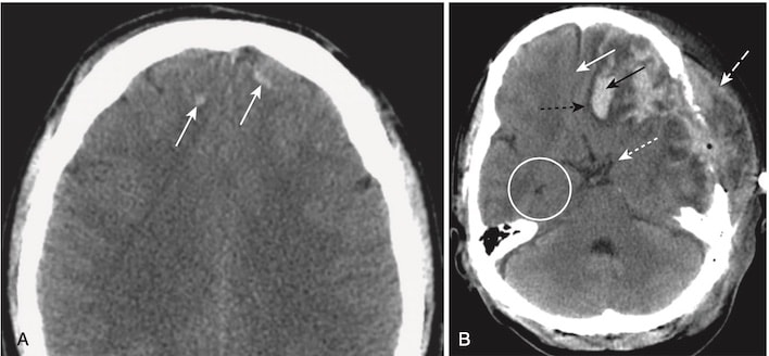- Đụng dập xuất huyết não có thể xuất hiện dưới dạng nhiều vùng nhỏ, được phân cách rõ ràng với đậm độ cao trong nhu mô não (xem Hình 10, A).