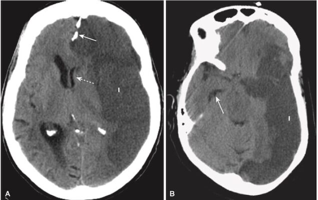 - Đánh giá CT não ban đầu trong trường hợp khẩn cấp tập trung vào việc có (a) hiệu ứng choán chỗ (mass effect) và (b) máu hay không.