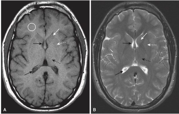 - Các chấm xuất huyết nhỏ có thể sáng trên hình ảnh T1w. (Trên một số chuỗi quét mới hơn, những chấm xuất huyết này có thể có màu sẫm.)