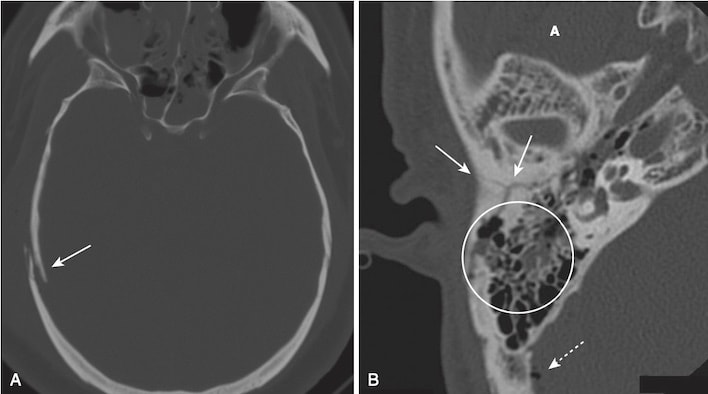 - Có thể nghi ngờ gãy xương này nếu có không khí trong não (não chứa khí do chấn thương), chất dịch trong xoang chũm, hoặc mức dịch – khí trong xoang bướm (sphenoid sinus) (xem Hình 6, B).