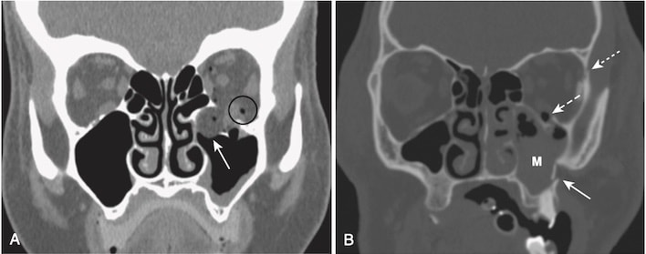 - Kẹt mỡ và / hoặc cơ ngoại nhãn, đi xuống dưới như khối mô mềm vào đỉnh xoang hàm trên