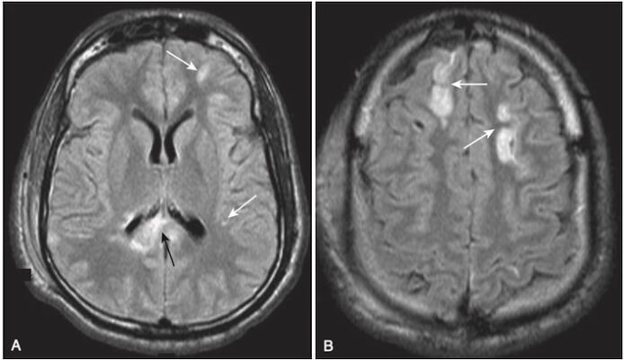 - Phát hiện thường gặp nhất là nhiều vùng sáng trên ảnh T2W tại điểm nối vỏ-tuỷ ở thuỳ thái dương hoặc thuỳ đỉnh hoặc trong thể chai (Hình 13).