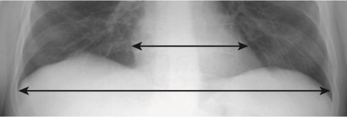 - Có thể ước tính kích thước của bóng tim trên phim chụp X quang ngực thẳng bằng tỷ lệ tim – lồng ngực, so sánh đường kính ngang rộng nhất của tim với đường kính trong rộng nhất của khung xương sườn (thường ngang mức cơ hoành) (Hình 1).