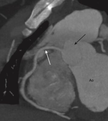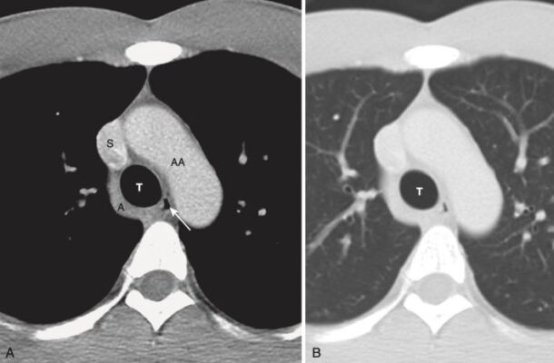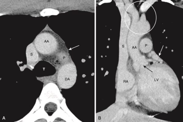 Hình 7. Mức cửa sổ chủ phế (A) và hình cắt đứng bên (vành/trán) (B). A, Ở mức này, có thể xác định được khí quản (T), động mạch chủ lên (AA) và động mạch chủ xuống (DA), tĩnh mạch chủ trên (S), và có thể là mặt trên của động mạch phổi trái (P), cửa sổ chủ phế (mũi tên trắng). B, CT đứng bên được định dạng lại cho phép chúng ta nhìn thấy cả tâm nhĩ phải (RA), tĩnh mạch chủ trên (S), tâm thất trái (LV), van động mạch chủ (mũi tên đen), động mạch chủ lên (AA), động mạch phổi chính (P), phần phụ tâm nhĩ trái (mũi tên màu trắng), và gốc của các mạch máu lớn (vòng tròn màu trắng).