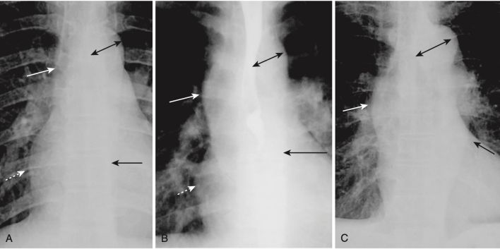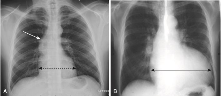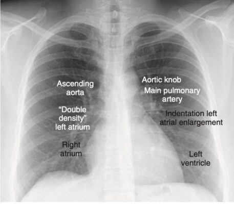 - Chứng tim lớn (Cardiomegaly), khi được nhận ra trên phim X quang ngực, chủ yếu là do giãn lớn của tâm thất, không phải do giãn rộng riêng biệt của tâm nhĩ. Do đó, tim thường có kích thước bình thường trong bệnh hẹp van hai lá sớm, cho dù tâm nhĩ trái đã to ra.