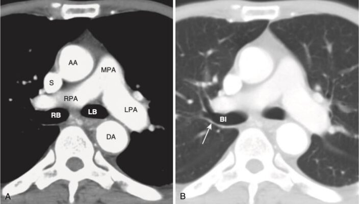 - Ở các mức này (có thể cần nhiều hơn một lát cắt để nhìn thấy tất cả các cấu trúc này), có thể xác định được động mạch phổi chính, động mạch phổi phải và trái; phế quản chính phải và trái; và phế quản trung gian.