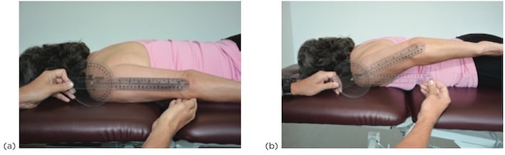 | Duỗi | Nằm sấp, khuỷu tay gấp nhẹ, cẳng tay trung tính | S: song song với đường nách giữa của thân F: mặt ngoài của củ lớn M: đường giữa mặt ngoài xương cánh tay đến lồi cầu ngoài | 0–60° | Tư thế thay thế: nằm ngửa cạnh mép giường, nằm nghiêng hoặc ngồi |