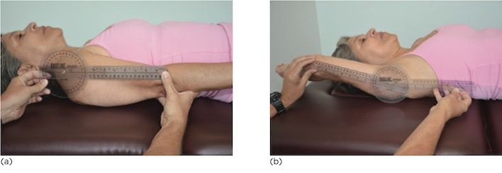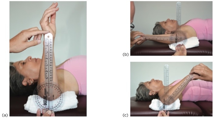 | Xoay ngoài | Nằm ngửa, vai dạng đến 90°; khuỷu gập 90° | S: vuông góc với mặt sàn F: mỏm khuỷu M: dọc theo xương trụ đến mỏm trâm trụ (styloid process) | 0–90° | Đặt một cuộn khăn nhỏ cạnh khuỷu để đảm bảo xương cánh tay song song với mặt giường Tư thế thay thế: nằm sấp |