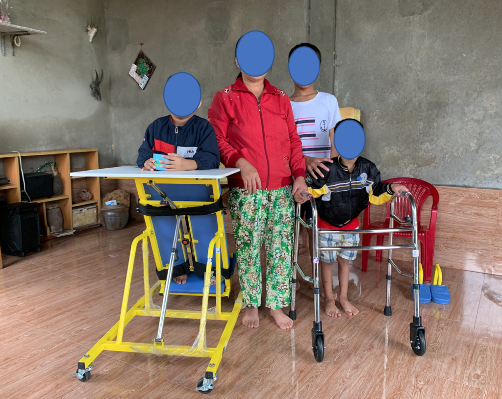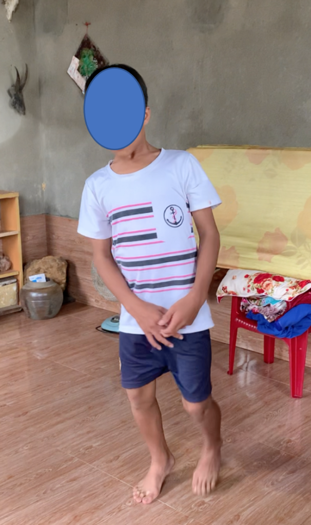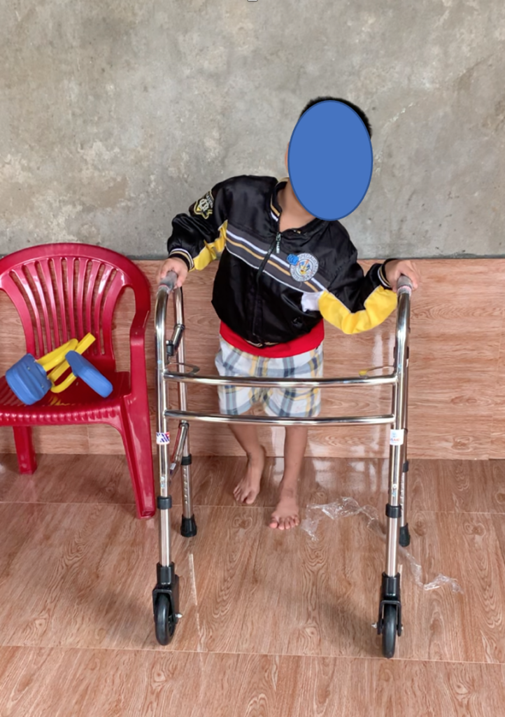 Vào nhà, tôi ngạc nhiên khi thấy có đến ba trẻ trai, trẻ lớn được 14 tuổi, hai đứa sau là anh em sinh đôi 8 tuổi. Dụng cụ này là dành cho cả hai trẻ. Hai trẻ này được xác định là khó khăn khi đứng, đi do yếu hai chân nặng dần và hiện tại chỉ có di chuyển bằng cách vịn thành tường hoặc lết sàn.