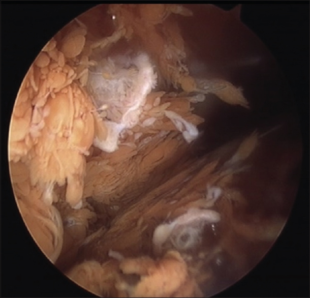 Bệnh nhân được lên lịch mổ nội soi khớp gối. Kết quả khi mổ là viêm bao hoạt dịch thể lông nốt sắc tố (PVNS, Pigmented Villonodular Synovitis), được phẫu thuật viên cắt bỏ các phần u nhú của bao hoạt dịch.