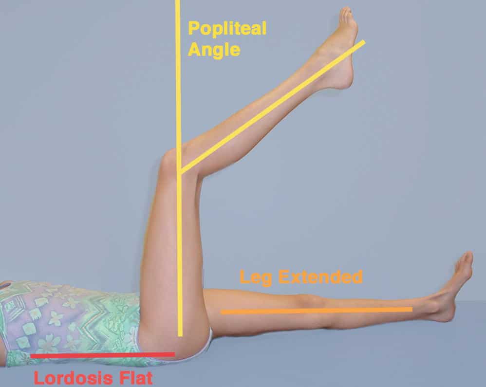 Tầm vận động. Tầm vận động (ROM) ở chi dưới nằm trong giới hạn bình thường, ngoại trừ căng các cơ hamstring, làm cho góc khoeo 145 độ ở cả hai bên. ROM chủ động đối với thân cho thấy gập ra trước giảm 50% (tức là các đầu ngón tay chỉ chạm tới giữa đùi), nghiêng sang bên phải giảm 30% (tức là các đầu ngón tay chỉ chạm đến đầu gối), và xoay sang bên trái giảm 30% khi so với hướng ngược lại.