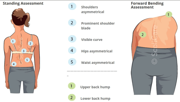 Nhìn. Không phát hiện chênh lệch nào về chiều dài chân. Quan sát từ phía sau cho thấy một đường cong cột sống ngực lồi sang bên phải và một đường cong thắt lưng với lồi sang trái. Độ cong nhìn chung đã bù trừ tốt, nhưng bệnh nhân có biểu hiện nghiêng đầu sang bên phải, vai trái hạ thấp xuống và nếp gấp ở eo bên trái cao hơn. Xương sườn bên phải của cháu gù về phía sau khi gập người về phía trước, và cơ dựng gai bên phải nổi rõ hơn. Xương bả vai cũng nổ rõ cả hai bên. Quan sát từ phía trước cho thấy thành ngực nổi rõ hơn ở bên trái.