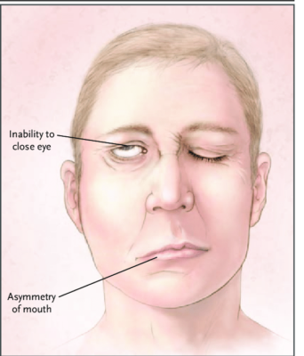 Bệnh nhân không thể co tự ý bất kỳ cơ nào do dây thần kinh sọ não VII bên phải phân bố. Anh ta không thể tự ý nhắm mắt phải, và nước bọt chảy ra từ khóe miệng bên phải.