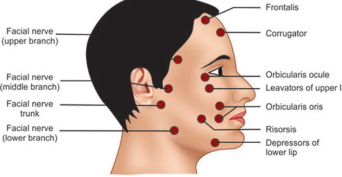 Ghi chú: Corugator: cơ (nhướn) mày; Risorsis: cơ cười; Levator/depressor: các cơ nâng môi trên và hạ môi dưới