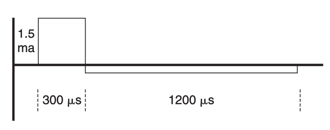 The patient was unable to voluntarily contract any of the muscles innervated by the right cranial nerve VII. He could not close the right eye voluntarily, and saliva drooled from the right corner of his mouth. The therapist was able to produce strong twitch and tetanic contractions in the muscles innervated by the right cranial nerve VII using pulsatile current. The stimulation parameters were biphasic, asymmetric, balanced pulses; 300 μsec initial negative phase duration and 1200 μsec positive phase duration; no interval between phases; 30 Hz and amplitude 1.5 mA (Figure 8-1). Contractions of similar quality