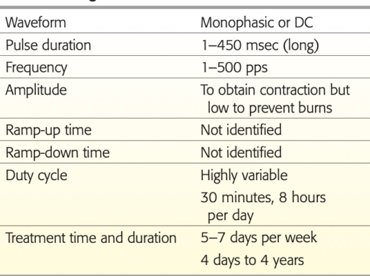 Dòng xung, với các đặc điểm xung như đã trình bày ở trên, được sử dụng hàng ngày trong tuần điều trị đầu tiên. Tổng cộng có 20 cơn co cơ được tạo ra ở mỗi cơ bị liệt. Bệnh nhân được hướng dẫn cách thực hiện xoa bóp các cơ bị ảnh hưởng và cách cố gắng thực hiện các co cơ tự ý bằng cách sử dụng gương để phản hồi 4. Vào 1 tuần sau khởi phát, các dấu hiệu rõ ràng của sự mất phân bố thần kinh đã xuất hiện, và KTV đã thêm dòng điện một chiều vào phác đồ điều trị. Vào 3 tuần sau khởi phát, KTV không thể tạo ra các cơn co cơ với dòng điện xung được nữa. Dòng điện một chiều được tiếp tục, và bệnh nhân được hướng dẫn cách sử dụng một máy kích thích tại nhà. Bệnh nhân trở lại để đánh giá lại hàng tuần.