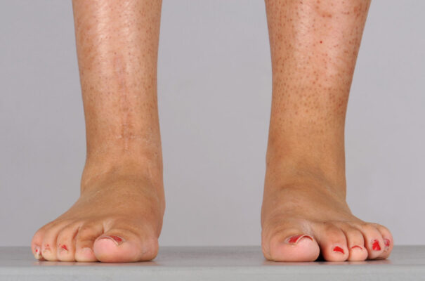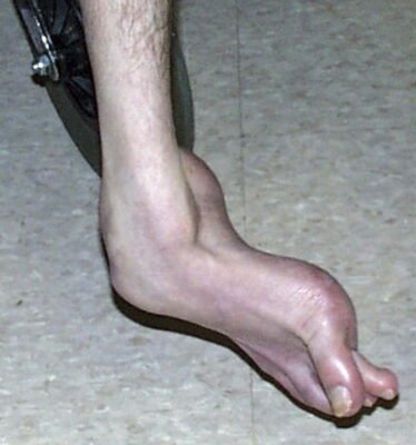 Một số bệnh nhân có biểu hiện chính là vẹo trong cổ chân, dẫn đến biến dạng vẹo trong đơn độc. Biến dạng vẹo trong làm cho mặt ngoài của bàn chân chạm mạnh vào mặt nền trong phần đầu của thì tựa, dẫn đến đau và thỉnh thoảng hình thành các nốt chai sần ở mặt ngoài của bàn chân. Một kết hợp thường gặp là duỗi ngón chân cái đầu thì tựa (ghi chú ND: biến dạng duỗi ngón chân cái được gọi là striatal toe deformity, cũng khá thường gặp trong bệnh Parkinson). Vấn đề này thường là do co cứng cơ ở chày trước kèm theo tăng hoạt của cơ duỗi ngón cái dài hoặc không. Tiêm botulinum vào cơ chày trước tương đối dễ dàng vì đây là một cơ lớn có thể sờ được ngay bên ngoài bờ trước xương chày.