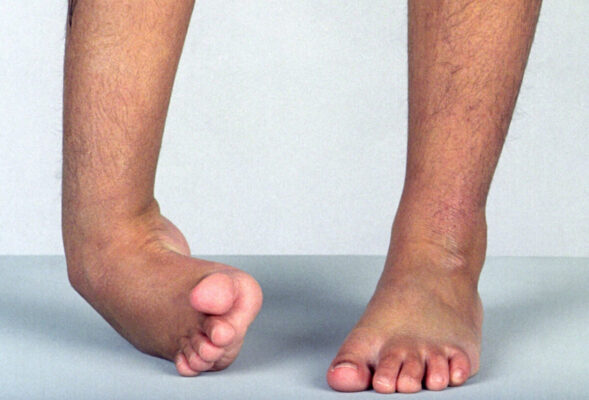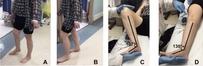 Cần lượng giá cẩn thận dáng đi của bệnh nhân để xác định chính xác nguyên nhân của vấn đề. Không phải tất cả các bệnh nhân không thể nhấc hở bàn chân và bị lê chân trên sàn trong thì đu của dáng đi đều bị co cứng cơ gập lòng bàn chân hoặc yếu cơ gập mu bàn chân. Nhiều bệnh nhân bị yếu cơ nghiêm trọng ở cơ các gấp háng hoặc gấp gối, dẫn đến không thể rút ngắn chân lại đủ trong thì đu. Nếu lượng giá dáng đi và khám lâm sàng bàn chân phát hiện biến dạng bàn chân ngựa hoặc bàn chân ngựa vẹo trong, thì bước thứ hai là xác định xem biến dạng đó là cố định (fixed) hay là động (dynamic, không cố định). Một biến dạng động có thể được chỉnh lại một cách thụ động khi nghỉ ngơi. Trong hầu hết các trường hợp, khớp bị ảnh hưởng là động (nghĩa là chỉnh lại được) ở một độ nhất định nhưng không thể đạt được tầm vận động cổ chân đầy đủ. Cần xác định khi nào tình trạng co cứng dừng lại và bắt đầu có sự thay đổi mô mềm (nghĩa là bị co rút, ND), vì tầm độ vận động đó thường là tầm độ vận động có thể đạt được khi xử trí thích hợp bằng các phương pháp như bài tập kéo giãn, tiêm botulinum hoặc nẹp bàn chân.