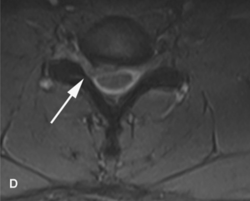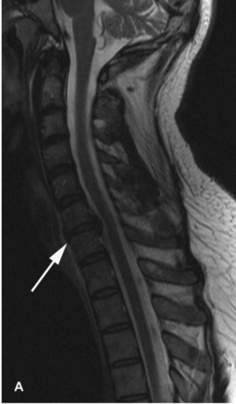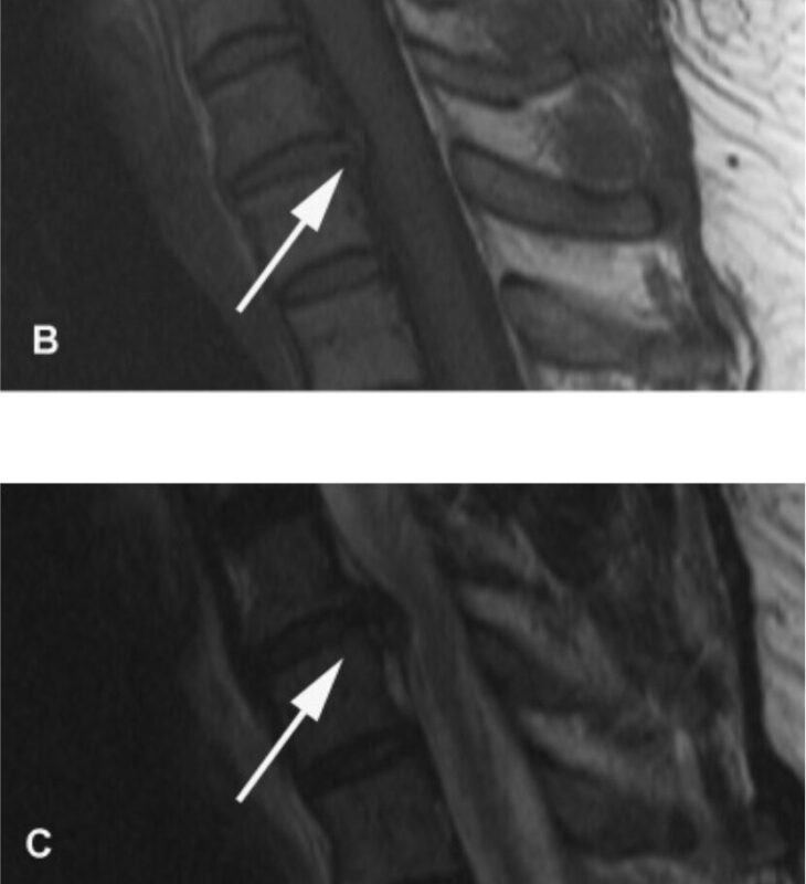Hình 1. Hình ảnh MRI cột sống cổ của bệnh nhân được mô tả trong bài này. Hình A là hình T2 đứng dọc cho thấy lồi đĩa đệm C6-C7 lấn vào khoang dưới nhện cổ. Hình ảnh B và C cho thấy đĩa lồi ra trên hình ảnh T1(B) và T2 (C). Có vết ấn nhẹ ở tủy sống nhưng không bị chèn ép đáng kể. Hình D là mặt cắt ngang của đĩa đệm thoát vị cho thấy giảm khoang dưới nhện lỗ liên hợp ở bên phải (mũi tên).